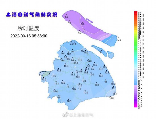 據上海市氣象局官微,今天仍是晴到多云的燦爛天氣,隨著冷空氣滲透南下,氣溫急剎車!早間大部分地區跌至10℃左右,北部的崇明只有5~8℃,早晨出門瑟瑟發抖,預計今天最高氣溫21℃,全天溫差高達到10℃,一定要注意調整衣物哦!告別了昨天的大風,今天風力也恢復正常,東到東南風3~4級。相對濕度95~50%,火險等級4級,易燃,需注意用火用電安全。