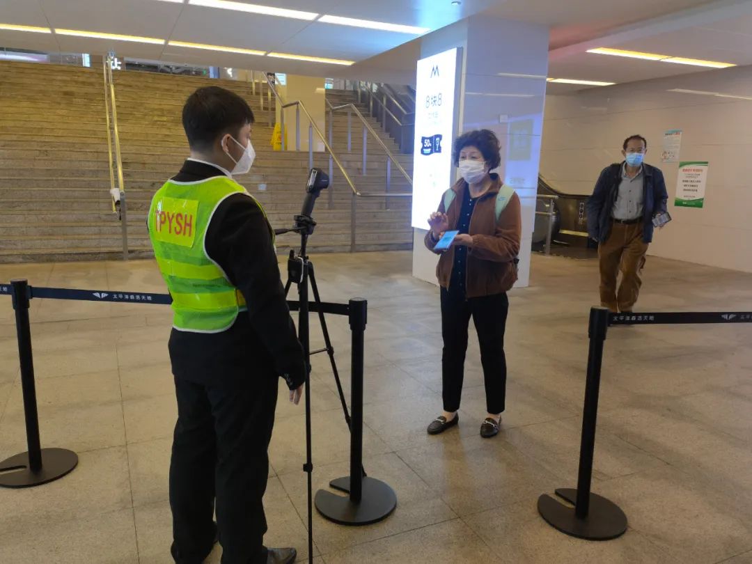 記者在太平洋森活天地內看到,市民進入商場前,首先需要測量體溫,并由工作人員查驗健康碼,以及口罩佩戴情況。