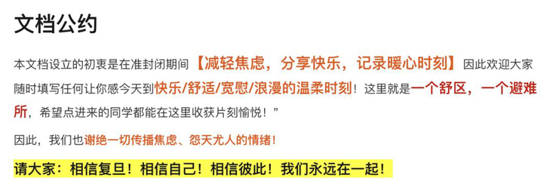 3月13日下午,校園準封閉管理即將啟動,一份名為《溫柔時刻分享組&精神互助避難所》的共享文檔在復旦人的朋友圈中火了,大家親切地將它稱為“溫柔文檔”。