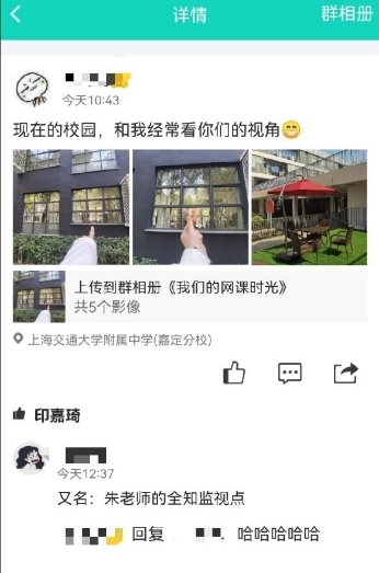 因此,朱慧敏在學生群中新建相冊“我們的網課時光”,分享了自己的網課閑暇時的瞬間,然后邀請學生們分享自己的“辦公地點”、網課趣味瞬間等等,以“云端”共享的方式縮短師生之間、學生與學生之間的距離。