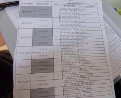 根據安排,每戶居民每天共有四次前往共用衛生間清潔小馬桶的時間,每次15分鐘,前后兩戶居民在使用前后還留有5分鐘間隔時間。