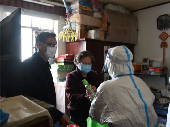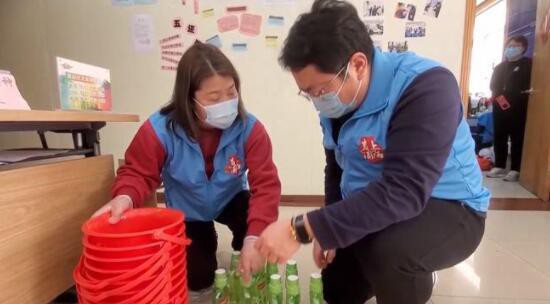 “123456……小馬桶每戶一個,漱口水每人一瓶,統一發放上門!痹诰游瘯,工作人員將物品數量一一清點,解決居民個人衛生清潔問題。準備工作完成后,工作人員變身“大白”,向居民樓出發,為各戶居民派送物資。