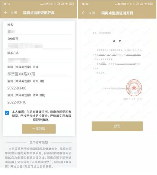 除了開具居家健康監測證明,記者獲悉,奉賢區旗艦店還上線了“隔離點醫學觀察證明”免申即享服務,該服務全區范圍(入境隔離除外)已開通。家住奉賢的居民動動手指,足不出戶就能獲取證明,非?旖莞咝。