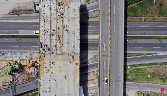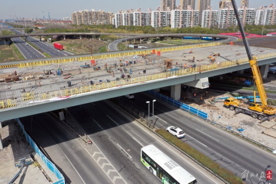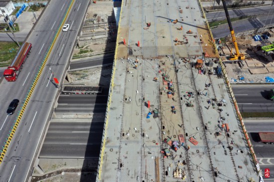 2022年3月15日,施工人員在沿江通道西延伸(江楊北路-富長路)主線高速公路改建1標高架橋面施工。日前,沿江通道西延伸(江楊北路-富長路)主線高速公路改建1標完成最關鍵節點——主線跨蕰川公路結構貫通。