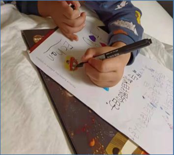 一封來自稚童的五彩斑斕的信,溫暖了所有人的心。從孩子歪歪扭扭的筆跡中,可以看得出寫字對他來說并不是件容易的事,但他寫每一個字都很認真、清晰。點綴在信中的愛心、笑臉圖案和小動物,又透出孩童的天真爛漫。從Echan媽媽發來的照片看,Echan畫畫時還是個可愛的“左撇子”。