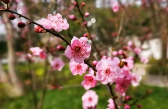 陽春三月,莫負春光,松江醉白池公園內,美人梅花開悅人,滿目芳菲。美人梅先花后葉,花葉俱美,一年四季枝條紅色,為其他梅花品種中少見。因花開如垂絲狀,又有“垂絲美人”的美稱。