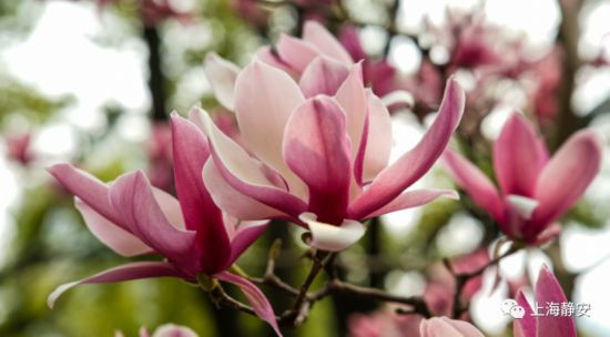 西康公園中約15棵玉蘭花爭相盛開,春風中一片姹紫嫣紅。紫色的二喬玉蘭正值盛花期,花朵鮮艷飽滿。