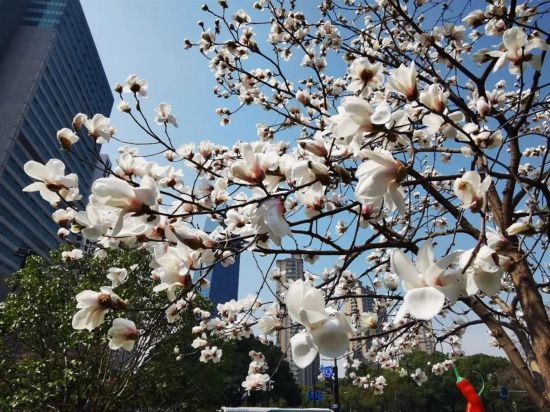 和煦春風下,人民廣場的玉蘭臨風皎皎,清香遠溢,惹人憐愛,隔屏飽下眼福,也是好不愜意。