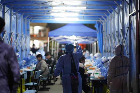 “臨近半夜,核酸檢測工作又開始了,大家這次熟練了很多……很累,但一切都很值得,就盼著疫情快快過去……”志愿者、上海電影學院20級研究生范加新說。