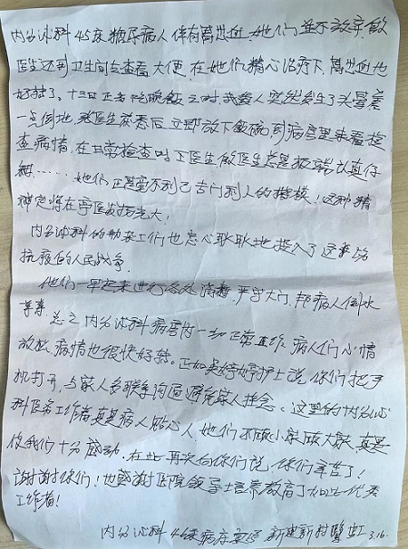 內分泌科的工勤師傅們也兢兢業業,一早就各處消毒,嚴守大門,為病人倒水等,總之,病房內一切正常,病人們心情放松,病情也很快好轉。護士吳婷婷還教我們和家人視頻溝通,免得家人掛念,真是我們的貼心人。她們不顧小家顧大家,使我們十分感動,謝謝你們,你們辛苦了!也感謝醫院領導培養、教育了如此優秀的工作者!