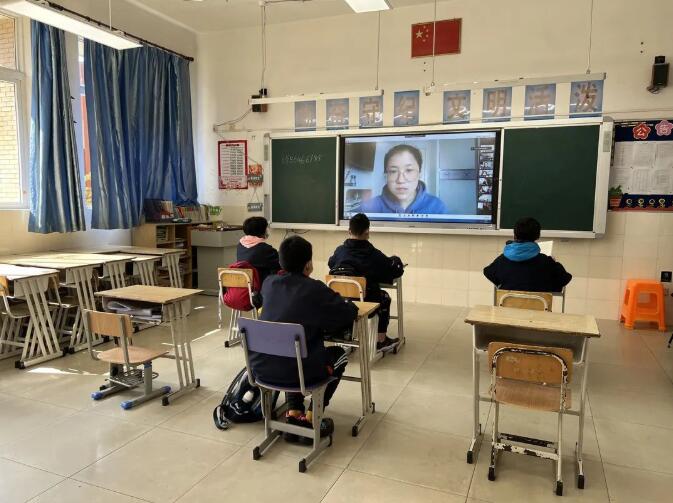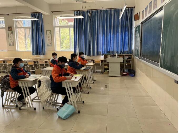 在學校一間教室里,桌椅被重新擺放,4名六年級的學生間隔坐開,緊盯教學大屏幕,跟隨老師線上學習。由于學校為教室配備了齊全的線上教學硬件設備,雖然身處教室,但孩子們也可以像其他居家孩子一樣實時提問、回答、與老師互動。