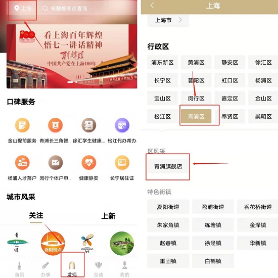 1.居民朋友打開“隨申辦”APP、“隨申辦”微信小程序或“隨申辦”支付寶小程序,點擊左上角“上!,選擇“青浦旗艦店”;