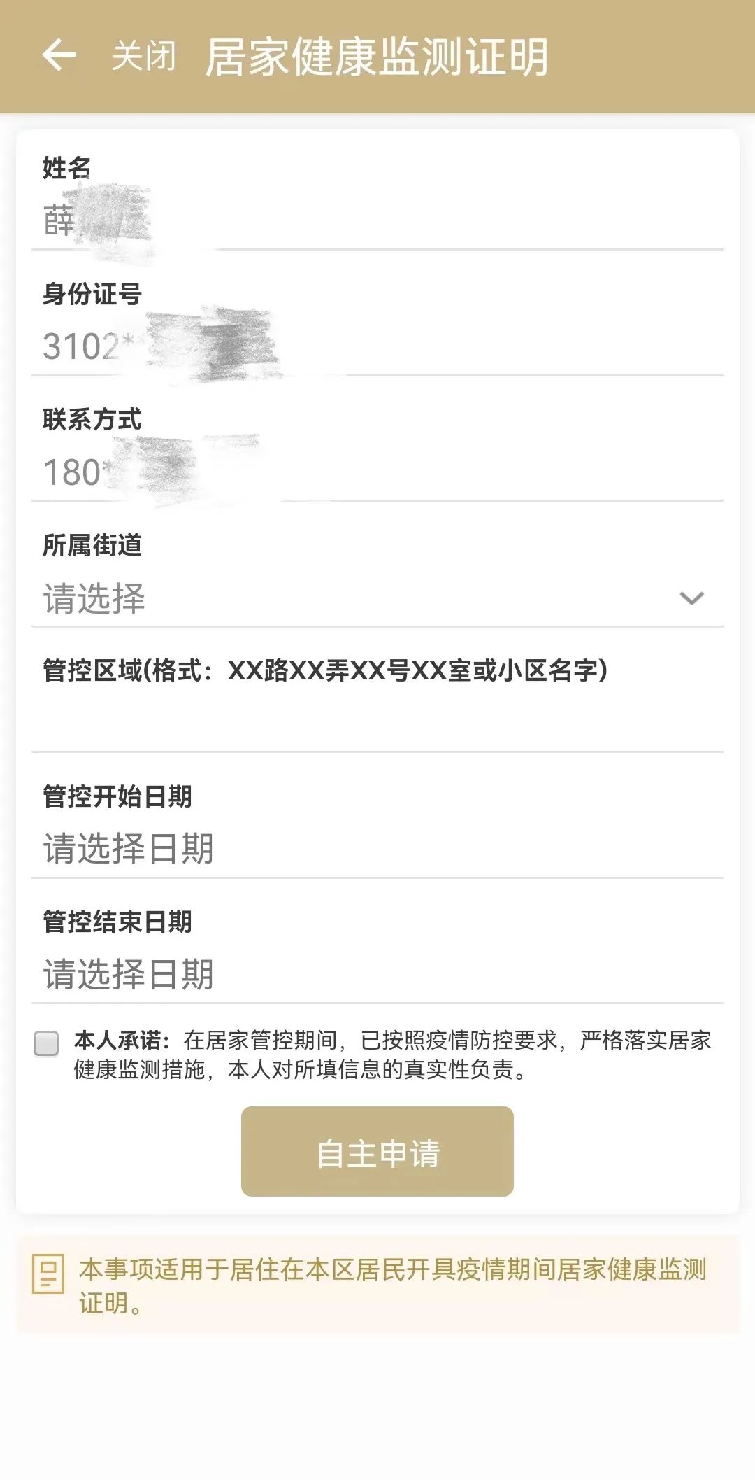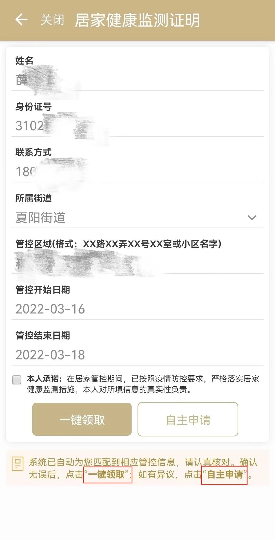 若比對數據與實際情況不一致,則進行“自主申請”,工作人員審核通過后,即可在線獲取“居家健康監測證明”。
