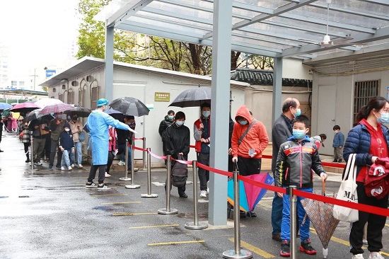 在上海市中西醫結合醫院的核酸采樣點,王舒婧和蔣玉潔正在維持核酸隊伍秩序。期間,她們還主動幫老人準備二維碼,為市民解答疑問。