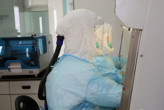 “實驗室機器不停的。凌晨兩三點來的樣本,我們直接做到天亮出結果!彼榻B。防護服穿脫復雜,為了“快”出結果,檢驗組便通過減少吃喝來控制上洗手間。每一輪實驗至少4至6小時,每次換防護服,內衣都濕漉漉的。