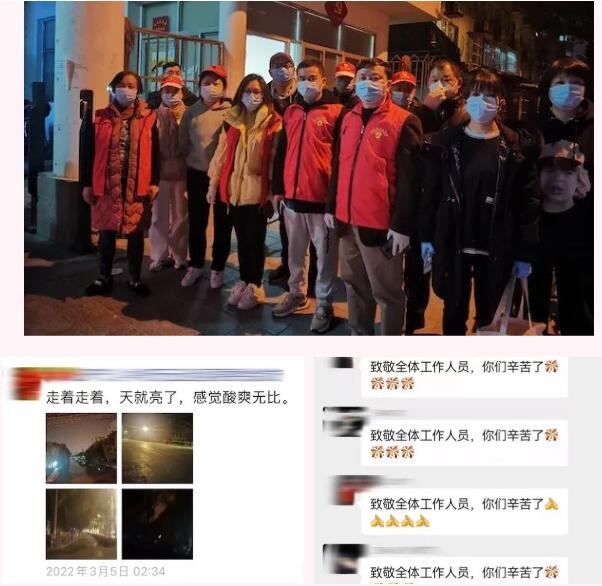九亭鎮天元居民區黨總支書記田宏從3月2日起,已經在辦公室的行軍床上睡了14天,在她的朋友圈里,記錄下了一次難忘的瞬間。那是3月4日晚,有一個小區解封,一棟樓新增封閉管理,幾棟樓等著做第二次核酸檢測,還有隔離人員需要轉運。奔波輾轉各個小區,等工作告一段落,已經是次日凌晨,田宏與2名社區工作者走在靜謐的街區里!拔乙呀涀卟粍恿,而我的同事們還風風火火地走在前面。其實,他們從年初開始就一直在忙,沒有休息過,也從來不抱怨!碧锖晔指锌,一抬頭,發現天光微亮,她發了一條朋友圈:“走著走著,天就亮了!彼說,居民們的聲聲感謝,是工作人員的最大動力。