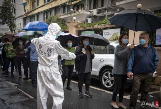 3月17日,在萬榮路上的大寧中心廣場的靜安區社會集中檢測點,靜安警方雨中維護現場秩序,引導市民有序排隊進行核酸檢測。