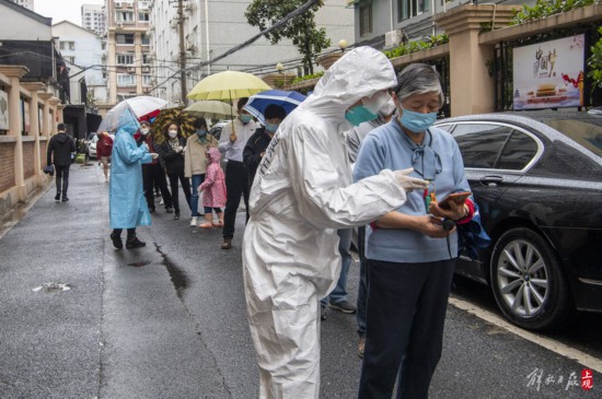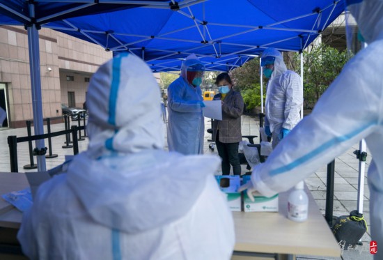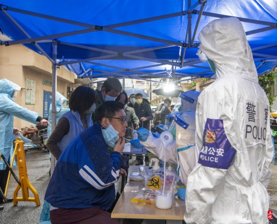 2022年3月17日,根據防疫要求,黃浦半淞園街道高雄社區內搭建了臨時核酸檢測點,對小區居民進行核酸篩查工作,居民排隊、掃碼、登記、核酸取樣,現場有序且高效。