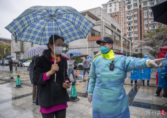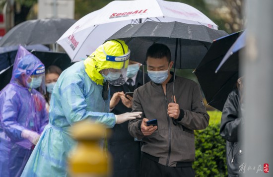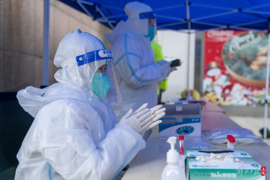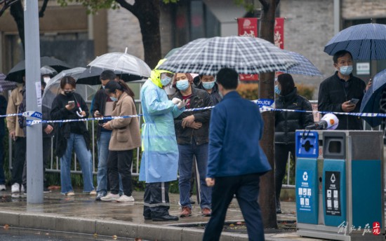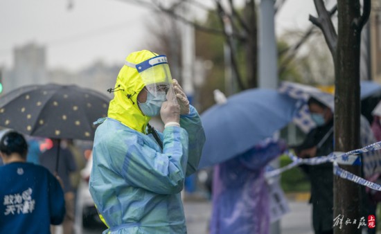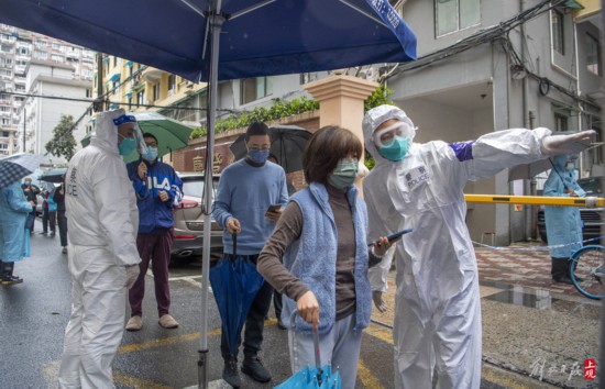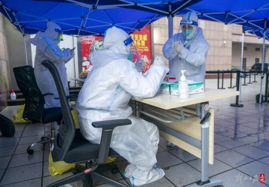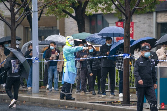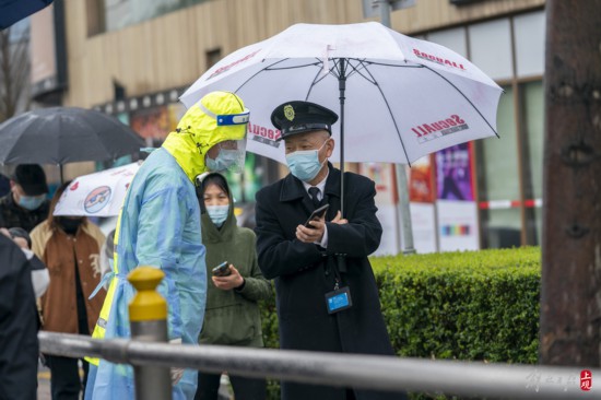 3月17日,申城連續降雨,氣溫下降,室外工作更是寒冷,在科恩大廈樓下,南京西路街道社區衛生服務中心的醫護人員在寒風中堅守崗位,核酸檢測工作井然有序。