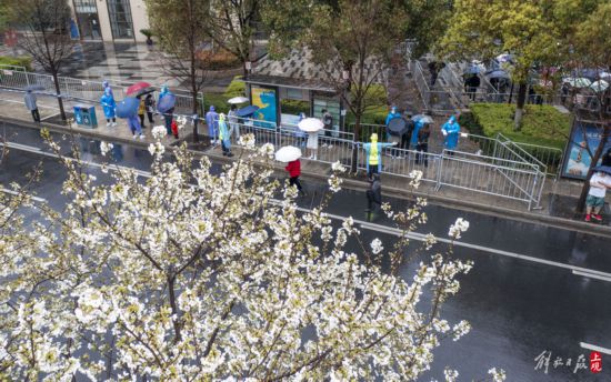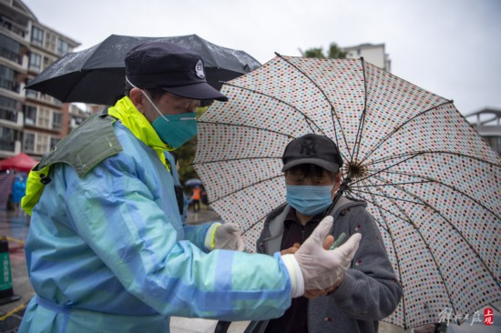 負責維護現場秩序的靜安民警擦去面屏上霧氣與雨水。