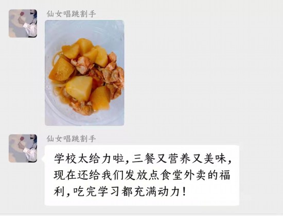 杜杜和室友在體驗了“專項服務”后非常開心。她說:“大愛學校!真的太太太貼心了!今天是在寢室健康觀察的第5天,看到學校上線了‘云訂餐’服務,立即下單,晚飯直接送餐到寢室樓底。重點是只要0.01元。!雖然在寢室健康觀察,但處處感受到了學校的溫暖與貼心,每天都是不重樣的飯菜,晚餐發放水果,各種物資和零食,表白辛勤付出的老師和后勤工作人員。沒有一個寒冬不能跨越,我們靜待春暖花開!”
