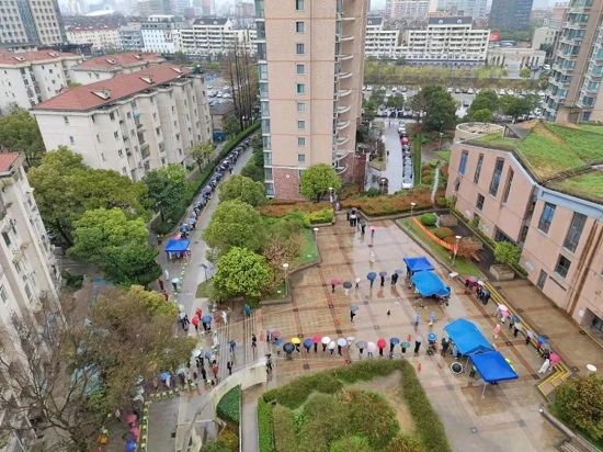 17日,淅淅瀝瀝的春雨給核酸采樣現場帶來些許不便,在四平路街道某小區,志愿者們提前規劃好篩查順序用喇叭告知居民,“叫到哪棟,哪棟再下來……”