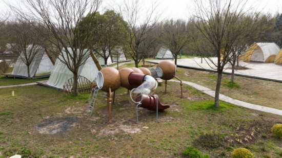 “人與自然和諧共生”是理想之境,“如何做好資源利用”是現實問題。結合崇明世界級生態島的建設,創作團隊希望通過藝術創作傳遞“生態保護”的重要性。作品《耗盡資源的討論》用被砍伐的樹木和即將燃盡的火柴兩大裝置警醒人們保護環境迫在眉睫,而作品《林·樂》則使用可回收材料玻璃瓶、塑料瓶、塑料桶在樹林間創新打造出色彩鮮明、純凈清澈的藝術景觀空間。