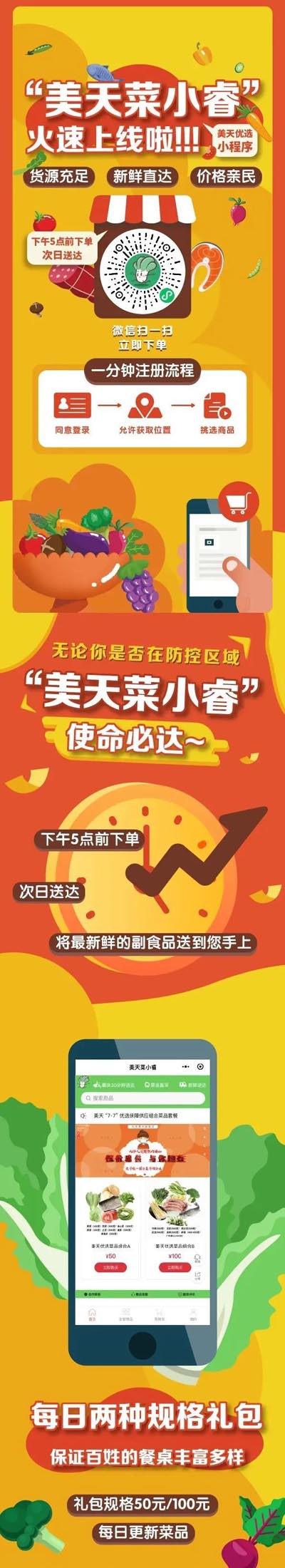 為保障長寧市民,尤其是近來封控小區居家隔離家庭的日常飲食需求,九華集團美天副食品公司攜手“菜小!,已上線“美天菜小!本上優選直供小程序,為長寧居民開通一條專屬購菜渠道。