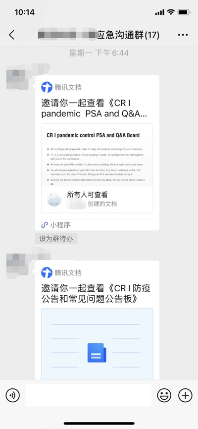 小區封控當天,居民區迅速成立了應急工作小組,并建立了應急溝通微信群,居委、小區樓組長、物業等都在群里。應急溝通群不僅發布了小區最新的工作安排,也梳理了各樓組里出現的問題。而周女士則主動請纓,及時將最新信息進行翻譯。封控當晚,當群里商議好公告內容后,周女士緊跟著就擬好了雙語隔離告知書,然后發在溝通群里,以便樓組長們可以在各自樓組的群里進行轉發。之后每次的信息發布,都是如此。封控伊始,小區事務多,信息更新頻繁。有了雙語公告,減少了群里信息的堆疊與重復,方便了中外居民都能同步接受到準確的信息。