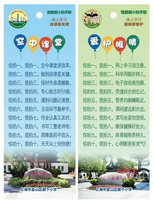金山區廊下小學運用拍手歌對學生進行行為規范教育,助線上學習更有趣有效。為了讓學生在線上學習做到自律,做到愛護眼睛,廊下小學除了統一制定學生線上學習要求外,還特地創作了《空中課堂》《愛護眼睛》兩首朗朗上口、富有童趣的拍手歌,把學校對學生線上學習的要求融于這兩首拍手歌中,助小朋友們線上學習更有趣、更有勁、更有效。