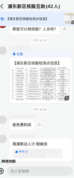 高德地圖上線了核酸檢測信息互助群功能,市民可通過群內互動的方式了解該檢測點的實時情況。在上海市普陀、黃浦、徐匯、靜安、閔行、嘉定、長寧、浦東等8個區內,聚焦核心商圈、交通樞紐、學校等人流量較為密集的區域,上線10個區域核酸檢測信息互助群。在群內,以群公告的方式展示區域內全部核酸檢測點的具體位置、預約方式、檢測時間等詳細信息;同時群中用戶還可就群內多個檢測點的人流量、排隊情況、周邊擁堵等信息,做實時的互動互助。