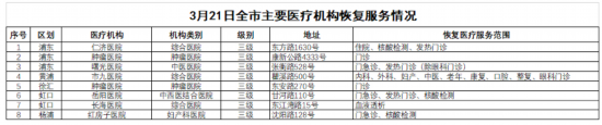 3月21日上海市、區主要醫療機構醫療服務暫停與恢復情況
