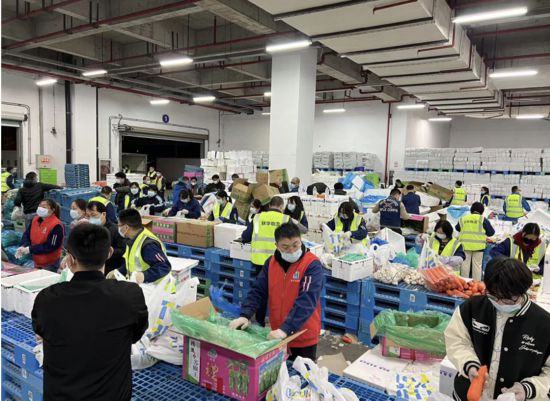 供應商緊急送到后,物流中心即刻召集所有員工裝配,人力不足,聯華總辦當晚9點在工作群內發布志愿者招募通知,員工們積極響應,60名志愿者即刻前往江橋物流中心進行支援。凌晨1點,1萬份安心套餐裝配完成。