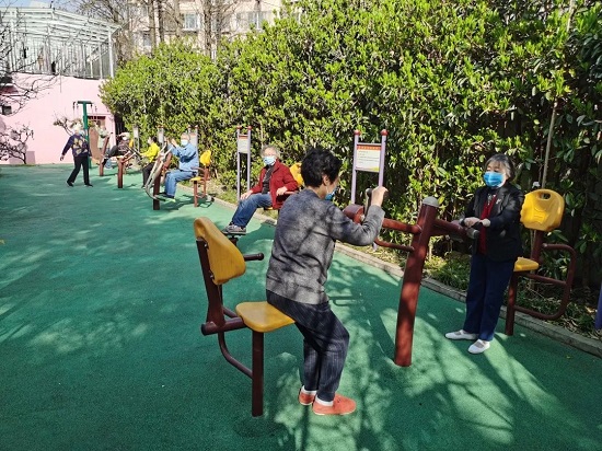 一早,位于民星路上的上海欣益養老院里一片歡聲笑語。中心花園被工作人員充分利用起來,劃分成多個區域:想做保健操的老人,來長椅區;想玩立式乒乓球的,去走廊區;想玩扔沙包游戲的,可前往小廣場……此外,在公用的活動器材擺放處,也有不少老人正怡然自得地使用著健騎機、太極推盤等鍛煉身體。