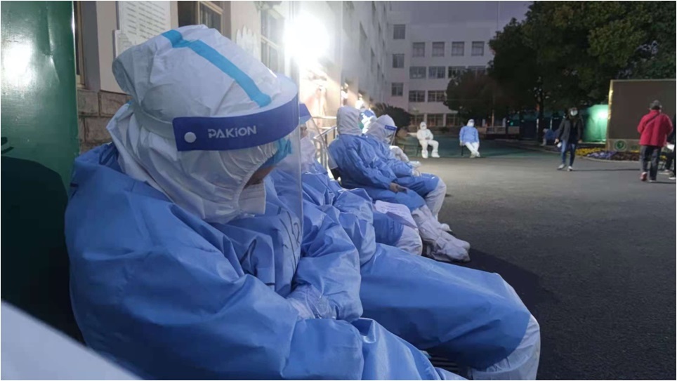 延吉社區的“大白”在深夜寒風中短暫休憩。