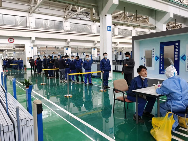 為助力企業安心生產,地產閔虹積極協調江川路街道疫情防控辦安排醫療力量走進三菱電梯、圣戈班汽車玻璃等生產企業,分別于3月14日、18日、21日開展了三輪核酸檢測。