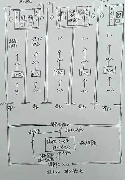 在總結每輪檢測工作經驗的基礎上,夏朵園居民區根據手繪圖,自創了“手形”動線,即有序安排居民分批在“手臂”處排隊,在“手腕”處“截流”安排志愿者掃碼核驗,隨后分流至“手指”處的工位完成檢測后再離開,避免了進出人流的對沖,防止了人員集聚,更提高了檢測效率。