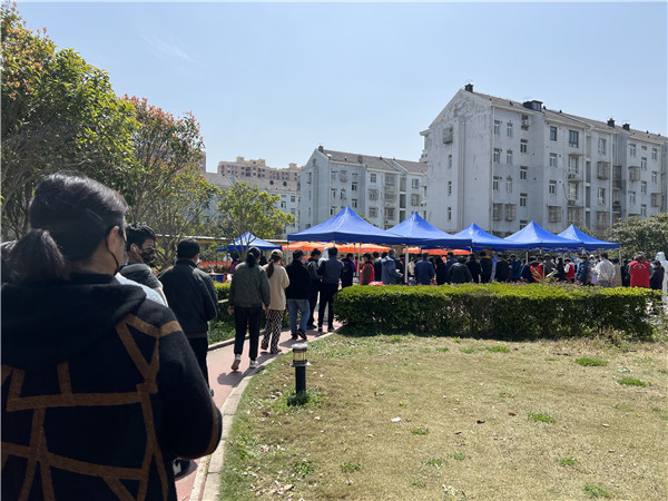 人民網上海3月23日電 (葛俊。3月23日,位于曹路鎮的銀豐苑小區內,許多身穿紅色馬甲的志愿者們一早就忙活起來了。他們有的手持大喇叭重復喊樓、有的一戶戶敲門、有的維持隊列秩序、有的將居民帶往小區中心廣場核酸檢測點……
