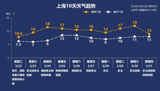 明后天上海將迎來短暫的降水間歇,氣溫也逐漸回歸到春天該有的樣子。明天(23日)多云為主,北風減弱至3-4級,早晚最低氣溫7℃附近,白天最高氣溫14℃,逐漸有些暖意。周四(24日)白天天空狀況更佳,晴到多云,最高氣溫可升至18℃,午后春光再現。想要洗洗曬曬的市民,要抓住這兩日,此后晴暖升溫的腳步將就此打住,雨水又要來了。