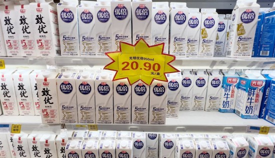 中午11時,東方網在仙霞路世紀聯華超市看到,產品貨架同樣滿滿當當。牛奶、雞蛋、水果、蔬菜等食品供應充足,其中當天到貨的光明優倍還有特價供應。