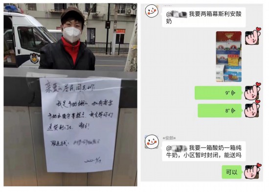 “有很多老年人不太會網購,也有很多老客戶說騎手總是不夠,外賣緊張。我就寫了張紙條貼在小區大門口,如果大家有需要的話可以給我打電話,我打包好給大家帶過來!睆執N告訴記者,疫情特殊時期,更要了解市民所需,也更要滿足大家的需求!蹦壳,上海地區各牛奶棚食品銷售門店都將陸續開展“上門服務”。