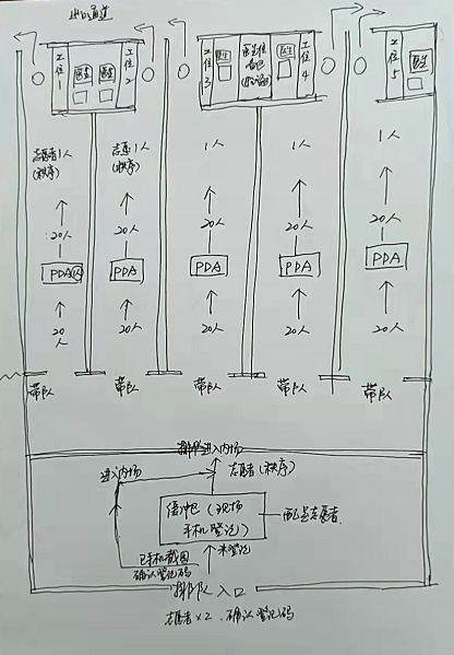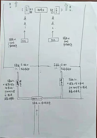 夏朵園居民區根據手繪圖,自創了“手形”動線,即有序安排居民分批在“手臂”處排隊,在“手腕”處“截流”,安排志愿者掃碼核驗,隨后分流至“手指”處的工位完成檢測后離開,避免了進出人流的對沖,防止了人員集聚,更提高了檢測效率。