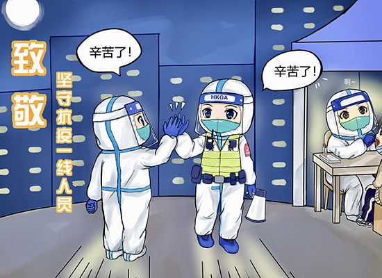 畫面正中間,在飄動的警旗下,對稱的“警察藍”和“大白”這兩份堅守正融為一體,“平時身穿警服,現在換上‘大白’防護服,其實都在維護社會治安,雖然衣服顏色不同,但心中信念從沒變過!边@幅作品出自虹口區出入境辦的95后文職輔警袁慧琳之手,身為輔警,雖然目前沒有在“疫”線,但她隨時做好了增援的準備。在后方駐守期間,袁慧琳想著憑借自己的愛好特長為虹口公安的小伙伴助力加油,也同時致敬所有奮斗在抗“疫”一線的“逆行者們”。