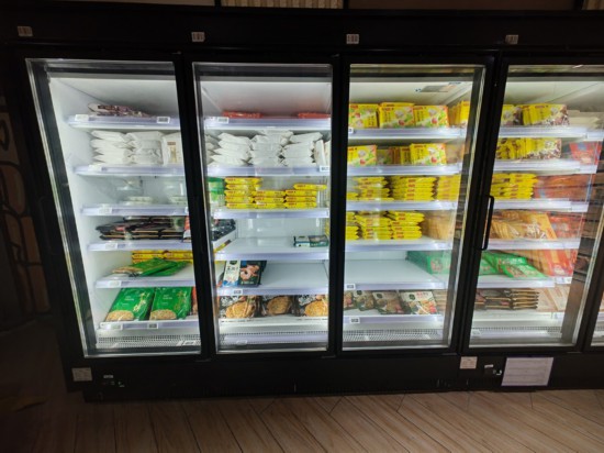 相比之下,貨架上的米面油以及奶制品、雞蛋則較為充足,另外方便面、冷凍水餃、冰凍肉類,還有魚蝦貝類等水產也仍然大量在售,日用品也是一切如常。