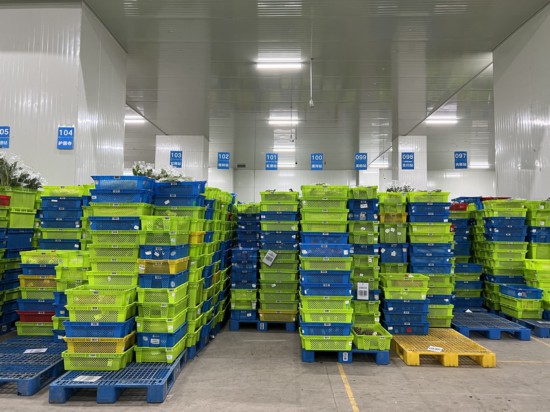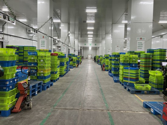 叮咚買菜蔬果倉內,送往各個前置倉的貨物已經“整裝待發”