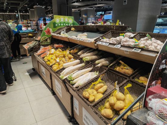 上海大潤發華漕店內,蘿卜、茄子、土豆等商品擺滿貨架,但綠葉蔬菜的貨架上余菜不多!罢诰o急調貨,下午就能補齊貨架,供應不缺,我們全店都在支援蔬菜補貨!钡昕傂煅绺嬖V記者,這兩天市民線上線下忙“囤菜”,門店的客人也很多!皬3月上旬開始,上海大潤發已經進入抗疫保供狀態。生鮮、米面糧油每天都會有新供給到貨。我們也增加了訂貨量,綠葉蔬菜、米面糧油一般會囤1-3天的量!毙煅绫硎,近兩日訂單激增疊加人手、運力不足,在崗的員工做起了分揀、客服,做好周邊居民的生活物資保供工作。