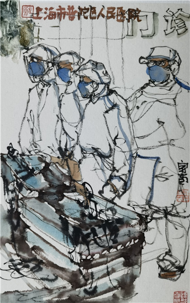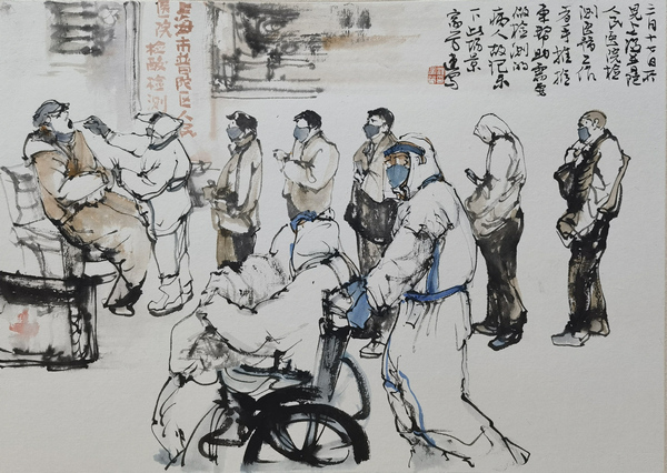 2022年3月17日,我在上海市普陀區人民醫院預檢處、門診部、核酸檢測點等,親眼看到醫務工作者一幕幕忘我奮戰的場景,感動至極。他們中,有的全神貫注傾聽病家問詢,有的合力診斷病人病因,也有的一絲不茍做著精準檢測。更有一位身著醫務服的“大白”,手推輪椅車幫助病人前來檢測。目睹眼前閃過的向“疫”而行,志愿同心的人間溫暖,我及時展紙揮毫,簡筆勾勒,記錄下可貴而又難忘的鏡頭。