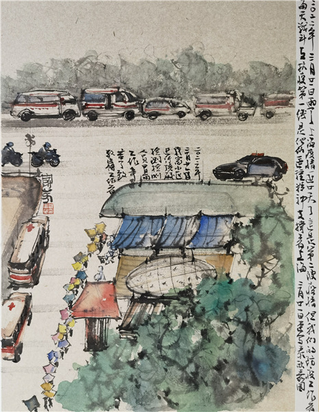這次速寫上海近期抗“疫”場景,我的情志更加感動與激動。作為以畫筆立身的美術工作者,真實記錄社會發展歷史場景,既是社會責任,也屬義不容辭的擔當。為那些堅守醫療崗位的醫務工作者,為那些挺身而出的平凡志愿者,更為那些默默無聞,保障街區平穩有序的各級干部,留下歷史文化的圖像。