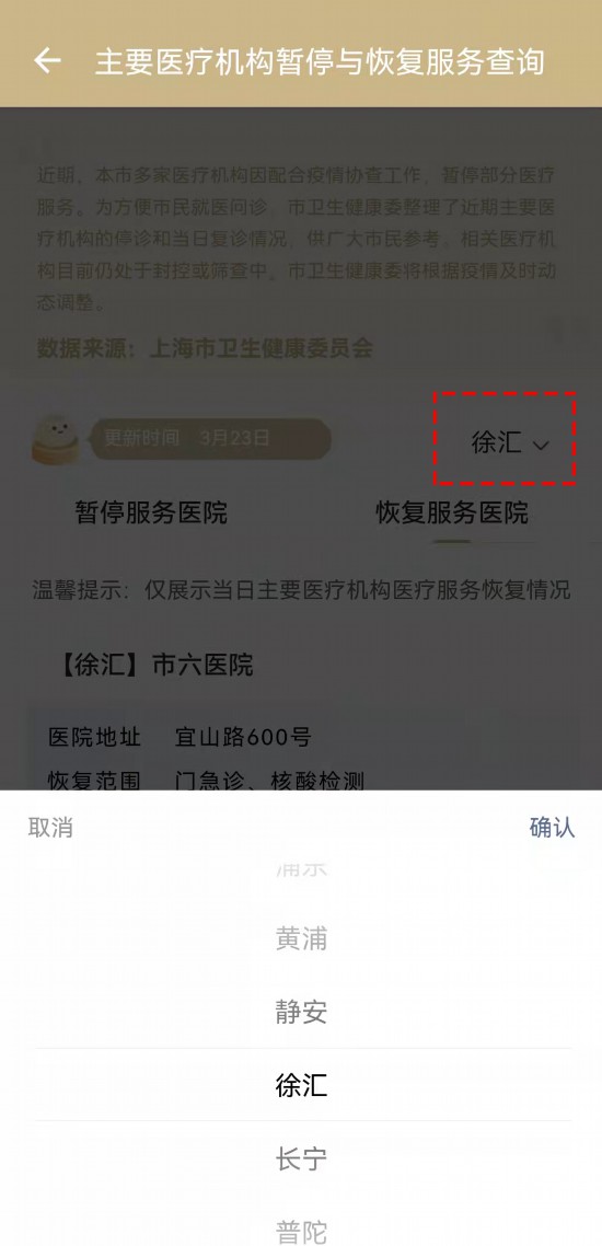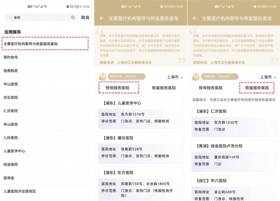 同時,您可根據市、區域搜索,更精準查詢到“暫停服務醫院”、“恢復服務醫院”信息。
