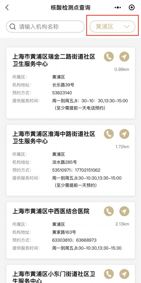 2.進入服務后,可通過定位直接查看距離自己最近的核酸檢測點,還可通過輸入機構名稱或以區篩選來查找意向檢測點。(以下截圖以“隨申辦”微信小程序為例)